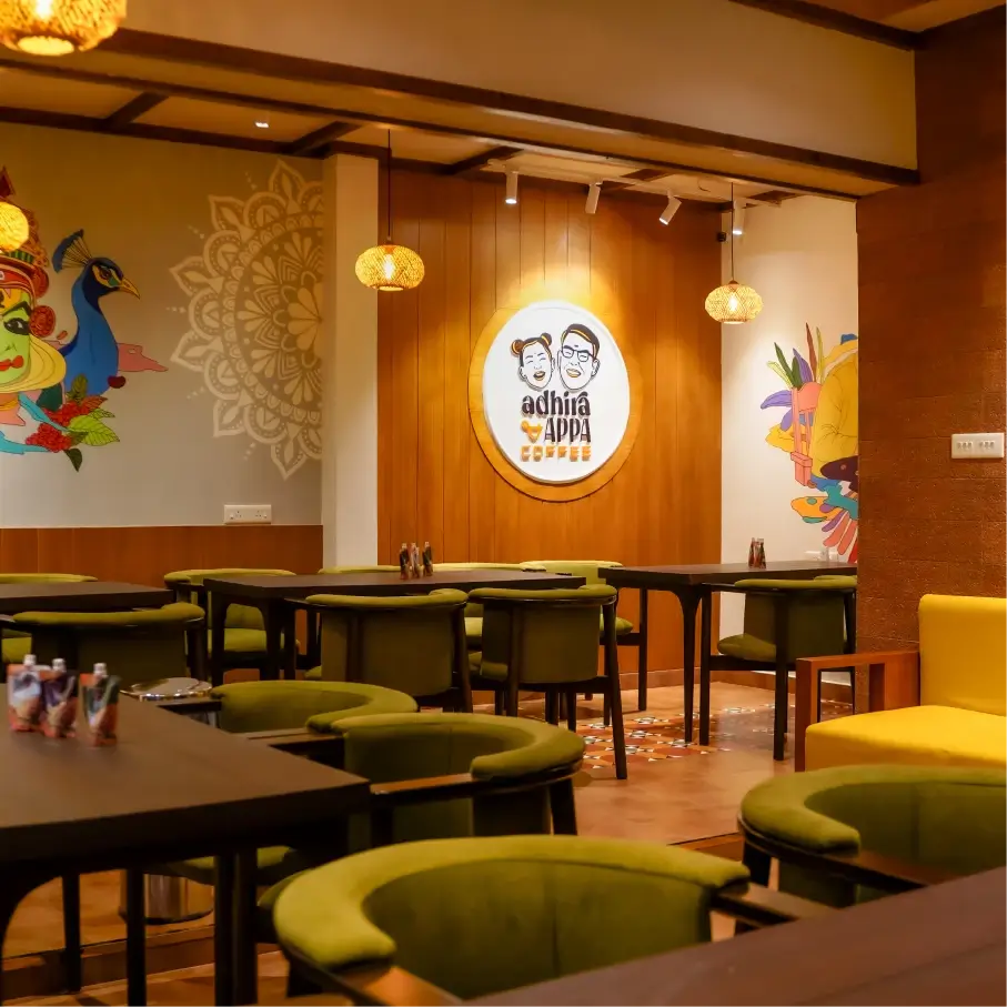 Adhira & Appa Coffee is designed as a heritage-inspired café where traditional filter coffee culture meets contemporary design. The space is transformed into a warm, customer-friendly environment with natural finishes, soft lighting, and a functional layout that supports smooth service and a welcoming café experience.